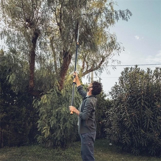 Fiskars tree pruners are multi-use tools that allow access to tree crowns and dense bushes, enabling the gardener to trim overhead without needing a ladder, or at ground level without bending or kneeling.