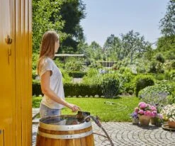 The barrel pump has a delivery capacity of 2,000 litres per hour and a maximum pressure of 2.0 bar. With the control valve, the pump’s water flow can be adjusted as required – even drip irrigation is possible. The timer allows you to select how long the pump should run. It then switches itself off automatically. And what if the rain barrel is already empty? Not a problem: The dry-running feature protects the pump from damage. A pre-filter is also integrated to keep dirt out. It can be easily removed and cleaned. The pump housing is robust and durable, as are all other components of the water tank pump. This is why we offer a five-year warranty when you register your purchase online.Of course, the garden pump can not only be used in rainwater tanks, but also for all other pumping tasks.
